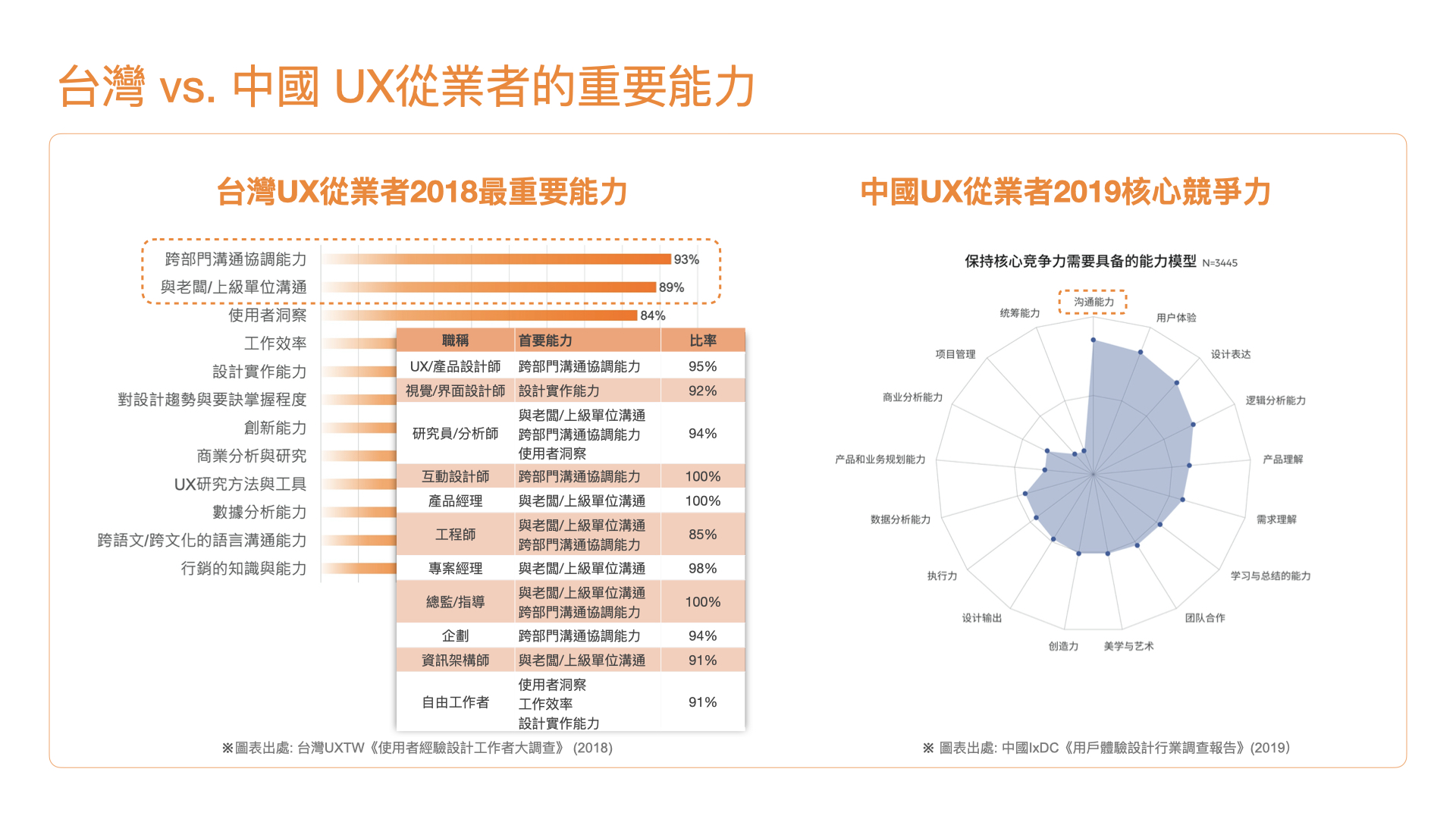 台灣與中國皆自2015年起對從業者能力進行調查,雖然兩地選項有所差異,但最有意思的是,兩份最新報告皆顯示,「溝通能力」是大家認為實戰工作上最重要跟最核心的能力;呼應了 NN/g 「UX從業者想在場域取得成功,所需最重要的技能為軟性技能,包含溝通或同理性等」的觀察。